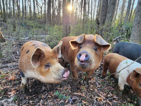 Here at Bowen Family Farm, we pride ourselves on raising our pigs as naturally as possible and providing you with high-quality, hormone-free pork for your family. We achieve this by practicing regenerative agriculture. We produce our own piglets and place them on pasture in an electric-fence training pen for two weeks. They are then let out into a paddock with other pigs to forage. They are moved onto new ground when we feel like enough soil and vegetation disturbance has occurred. This allows the pigs the opportunity to eat grass, roots, and critters that they would naturally consume. They are supplemented with quality feed from a local feed mill as well to ensure they are getting all the nutrients they need.